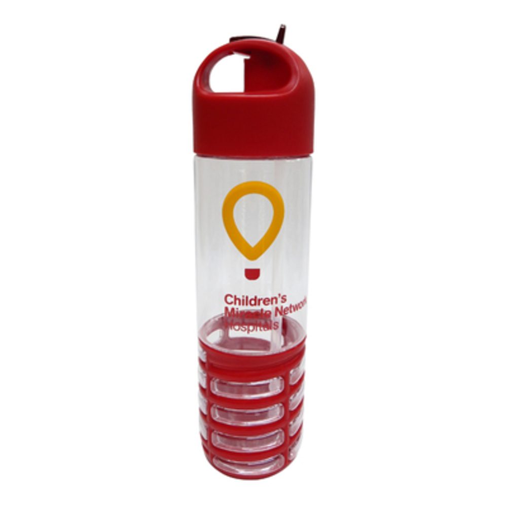 This hip bottle features a 22 oz. single wall, BPA free Eastman Tritan copolyester material with flip-up spout, carrying handle, inner soft straw, and molded base.